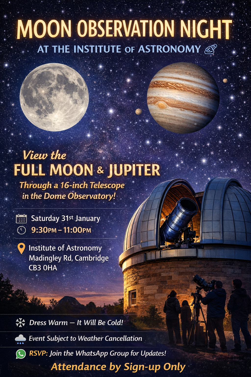 I organised and hosted a Moon Observation Night at the University of Cambridge’s Institute of Astronomy, bringing together a group of attendees for an evening that combined outreach and hands-on observing. The event began with a guided tour introducing telescope models and astronomy fun facts, before moving to the dome observatory for live viewing of the full Moon and Jupiter through a 16-inch professional telescope.