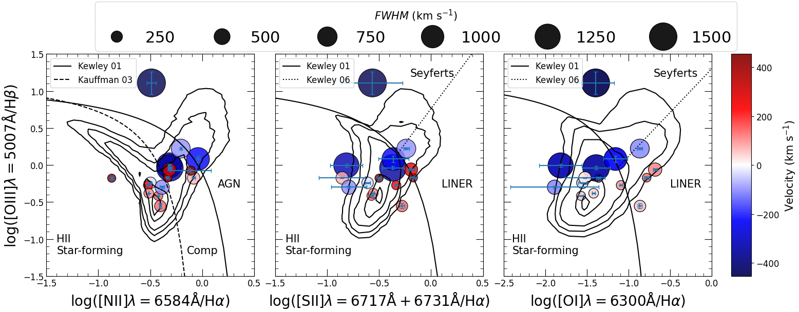 - Outflowing components predominantly located in the star-forming region of BPT diagrams, particularly in [SII] and [OI] diagnostics which are less affected by metallicity effects