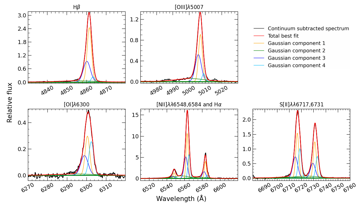 We performed detailed spectral decomposition using multiple Gaussian components to separate emission from the galactic disk and outflowing gas. This allows us to independently measure the physical properties and excitation mechanisms in different kinematic components.